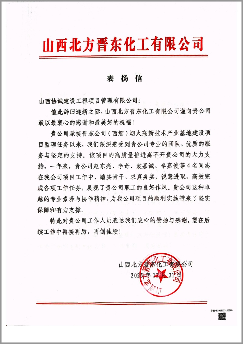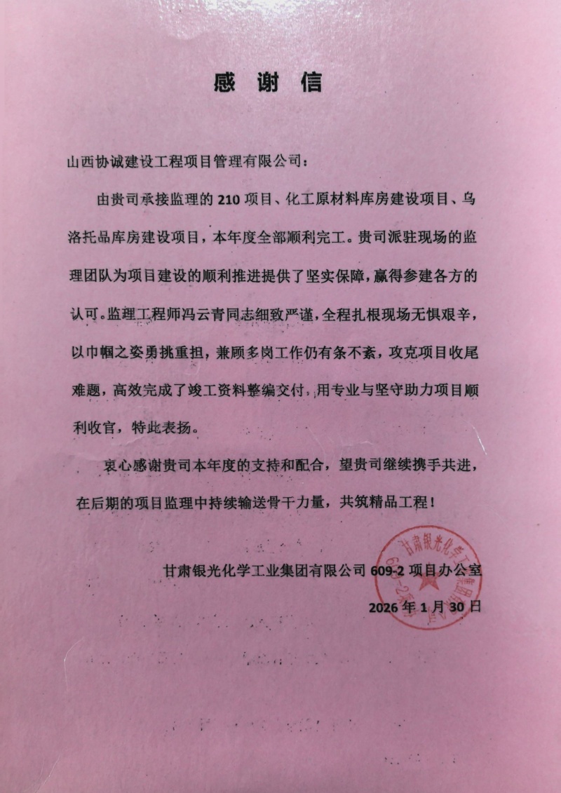 甘肅銀光化學(xué)工業(yè)集團(tuán)有限公司亦專程致信感謝。由我公司承擔(dān)監(jiān)理的210項(xiàng)目、化工原材料庫房、烏洛托品庫房三大工程于本年度全部順利完工。現(xiàn)場監(jiān)理工程師馮云青同志細(xì)致嚴(yán)謹(jǐn),全程扎根現(xiàn)場無懼艱辛,以巾幗之姿勇挑重?fù)?dān),兼顧多崗仍條理分明,攻克收尾難題并高效完成竣工資料整編交付,用專業(yè)與堅(jiān)守助力項(xiàng)目順利收官,贏得參建各方一致認(rèn)可。