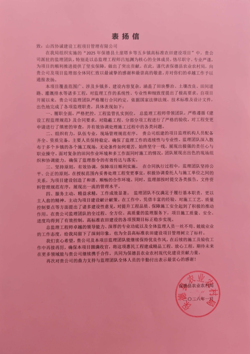 保德縣農(nóng)業(yè)農(nóng)村局也向我公司發(fā)來表揚(yáng)信。在“2025年保德縣土崖塔鄉(xiāng)等五鄉(xiāng)鎮(zhèn)高標(biāo)準(zhǔn)農(nóng)田建設(shè)項(xiàng)目”里,以總監(jiān)理工程師呂旭淵同志為核心的監(jiān)理團(tuán)隊(duì)履職全面、嚴(yán)格把控,工程監(jiān)管扎實(shí)到位;組織有力、隊(duì)伍專業(yè),現(xiàn)場管理規(guī)范有序;堅(jiān)持原則、有效協(xié)調(diào),保障項(xiàng)目順利實(shí)施;服務(wù)主動(dòng)、精益求精,工作成效顯著。他們以高度的責(zé)任心和豐富的經(jīng)驗(yàn),為項(xiàng)目建設(shè)創(chuàng)造了和諧、順暢的合作環(huán)境,確保了項(xiàng)目施工質(zhì)量、安全和進(jìn)度均達(dá)到預(yù)期目標(biāo)。