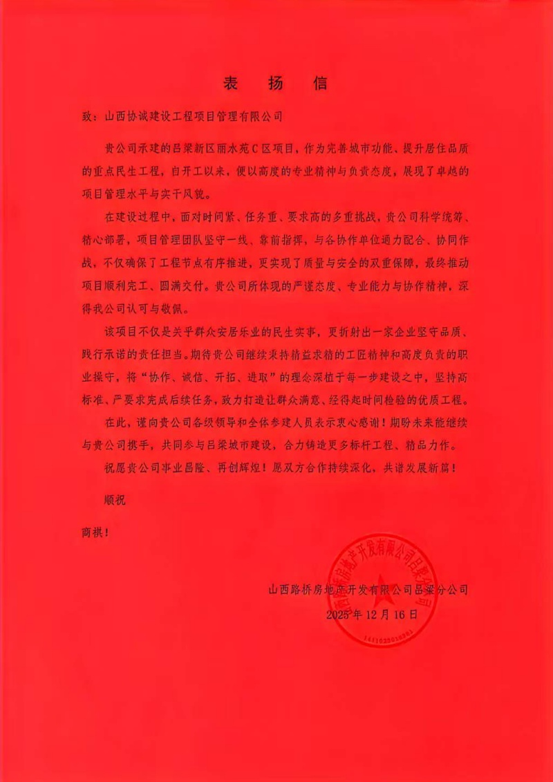 山西協(xié)誠建設(shè)工程項(xiàng)目管理有限公司喜獲多方表揚(yáng)